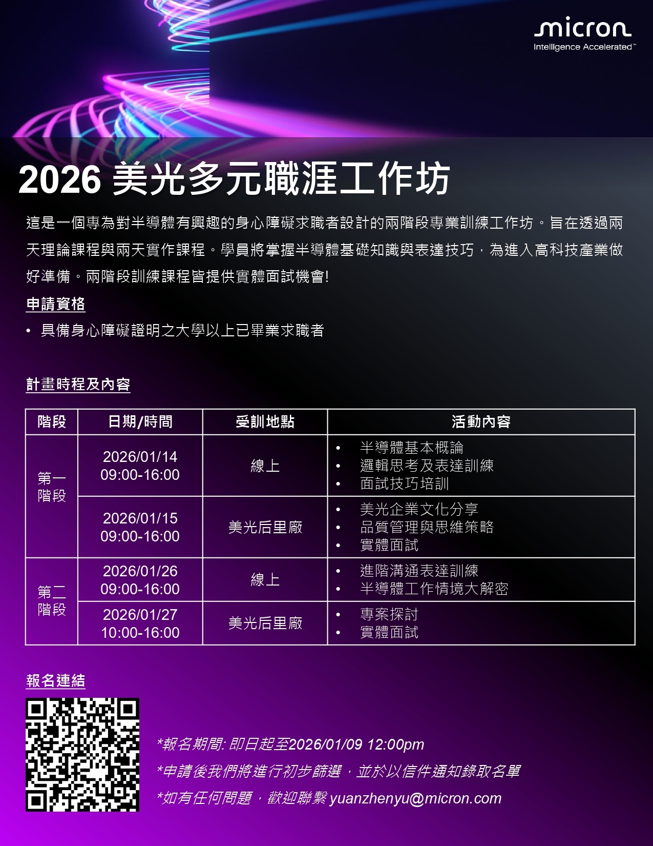 - 第二階段:115年1月26日(線上課程)、1月27日(美光后里廠實體課程)。